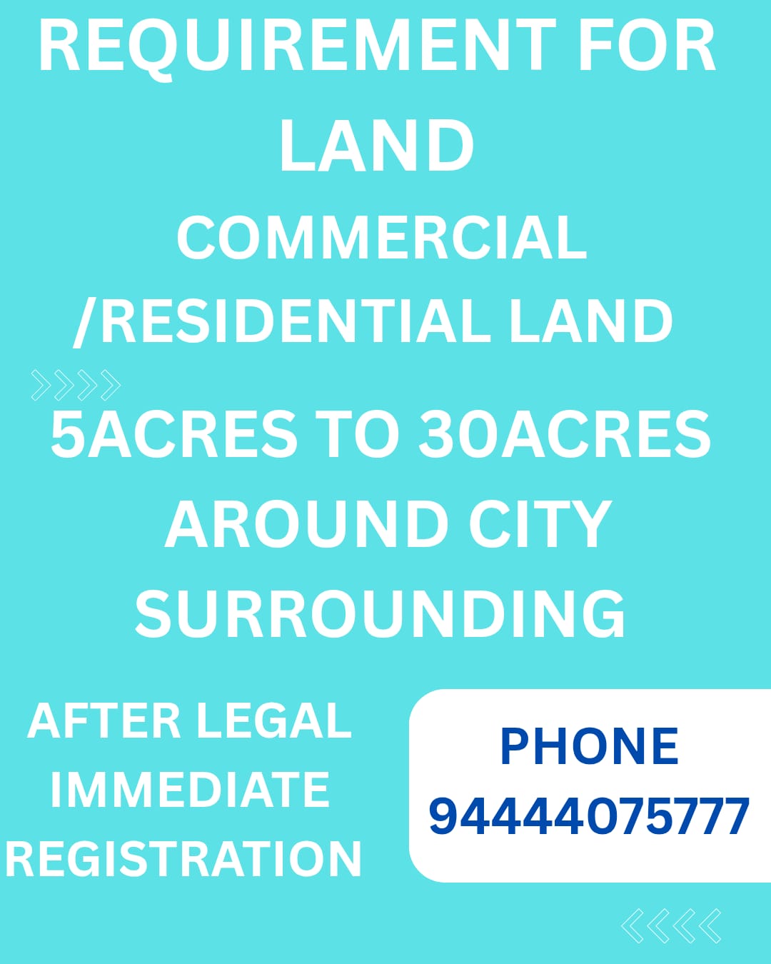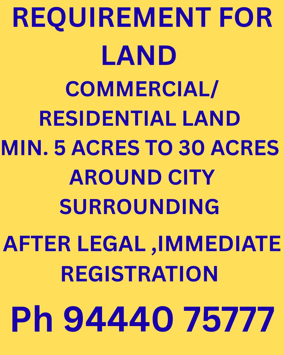 EnquiryREQUIREMENT FOR LAND COMMERCIAL / RESIDENTIAL LAND .......5 ACRES TO 30 ACRE AROUND CITY SURROUNDING AFTER LEGAL , IMMEDIATE REGISTRATION