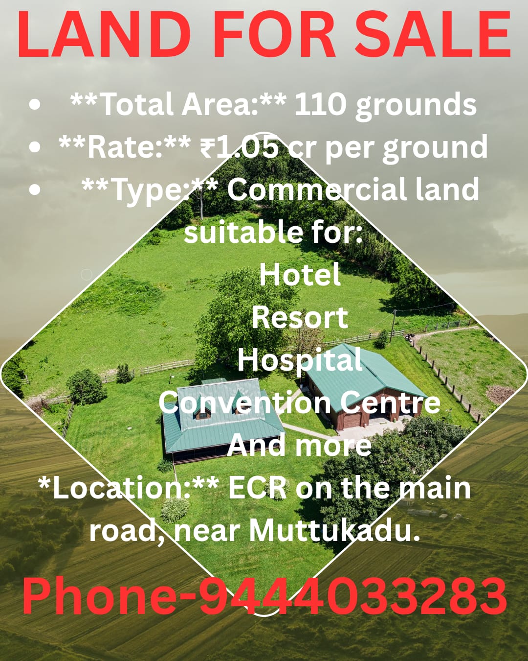 EnquiryTOTAL AREA 11O GROUNDS RATE RS 1.05 CROREPER GROUND TYEPE : COMMERCIAL LAND SUITABLE FOR : HOTEL , RESORT , HOSPITAL , CONVENTION CENTRE AND MORE LOCATION : ECR ON THE MAIN ROAD , NEAR MUTTUKADU