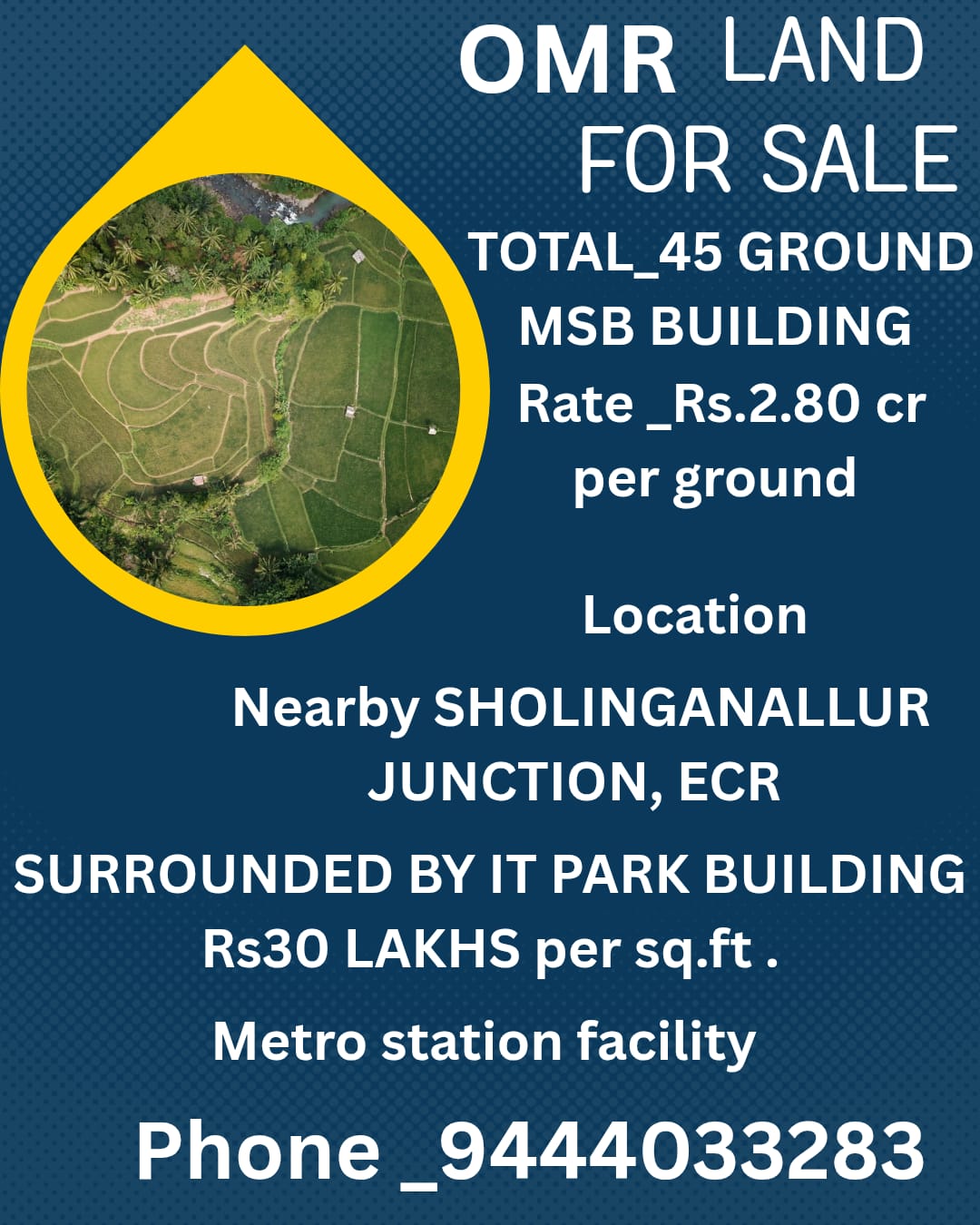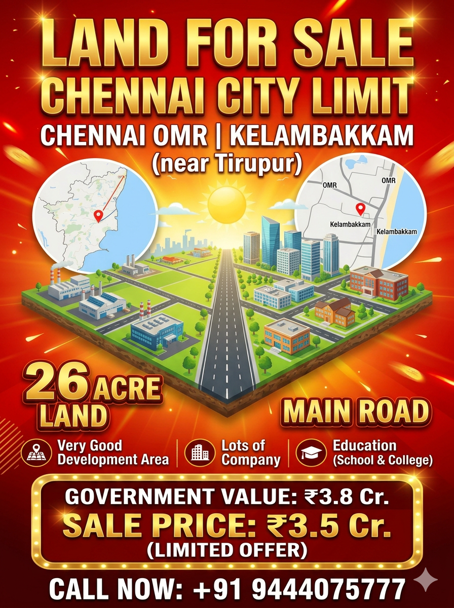EnquiryTOTAL -45 GROUNDS MSB BUIDING ....RATE -RS2.80 CRORE PER GROUND LOCATION : NEARBY SHOLINGANALLUR JUNC. , ECR SURROUNDED BY IT PARK BUILDING RS30 LAKHS PER SQ.FT , METRO STATION FACILITY