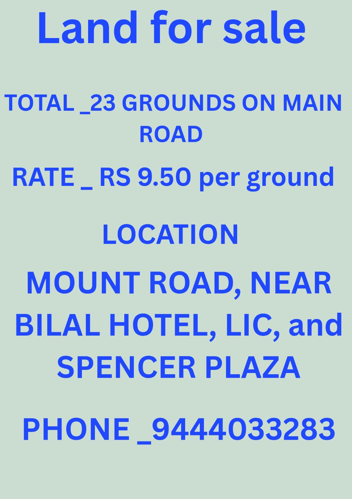 EnquiryTOTAL - 23 GROUNDS ON MAIN ROAD , RATE -RS- 9.50 PER GROUND LOCATION : MOUNT ROAD , NEAR BILAL HOTEL , LIC AND SPENCER PLAZA