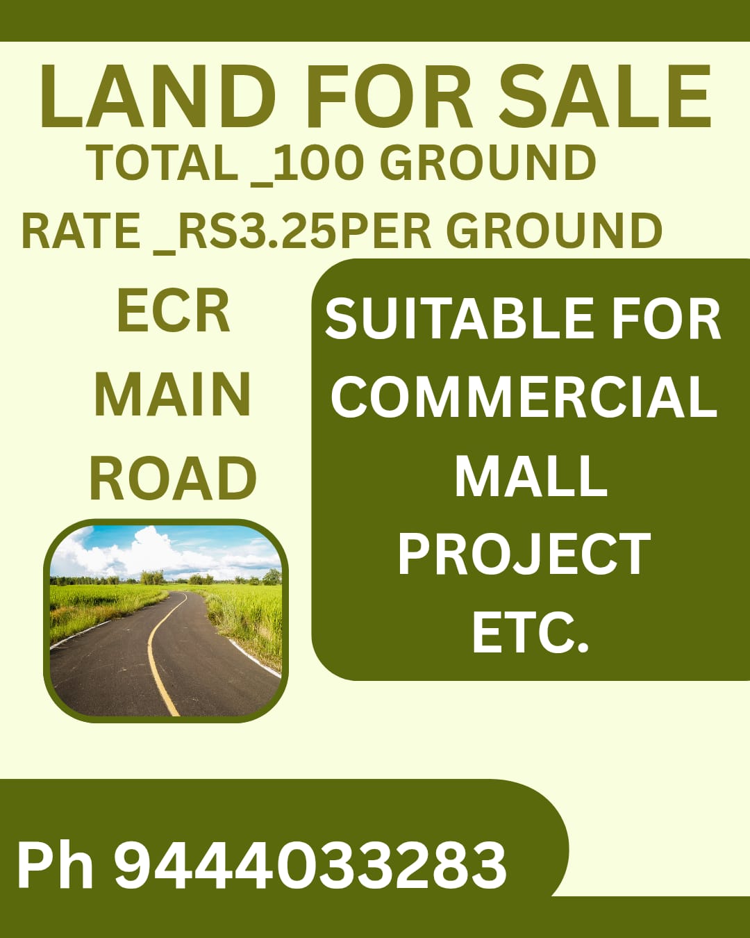 EnquiryTOTAL - 100 GROUND , RATE -3.25 PER GROUND , ECR MAIN ROAD , SUITABLE FOR COMMERCIAL MALL PROJECT ETC,