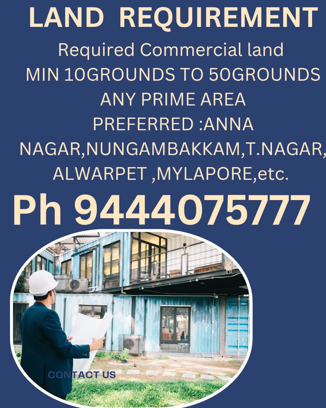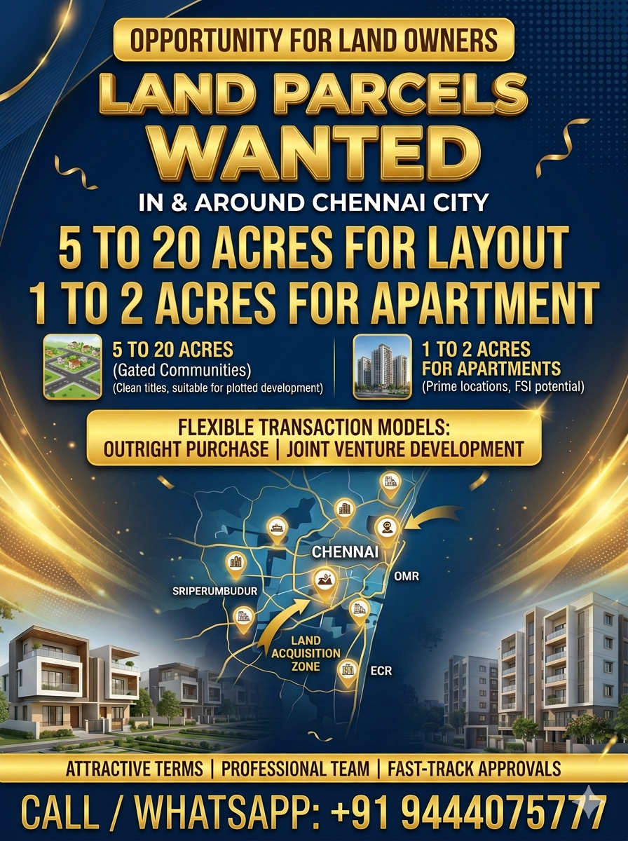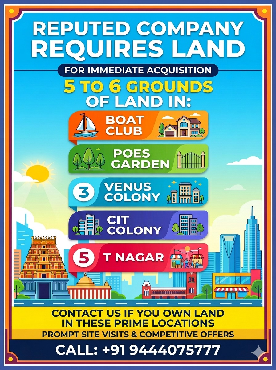 EnquiryREQUIRED COMMERCIAL LAND MIN . 10 GROUND TO 50 GROUNDS ANY PRIME AREA . PREFERRED : ANNA NAGAR , NUNGAMBAKKAM ,T.NAGAR , ALWARPET,MYLAPORE , ETC .