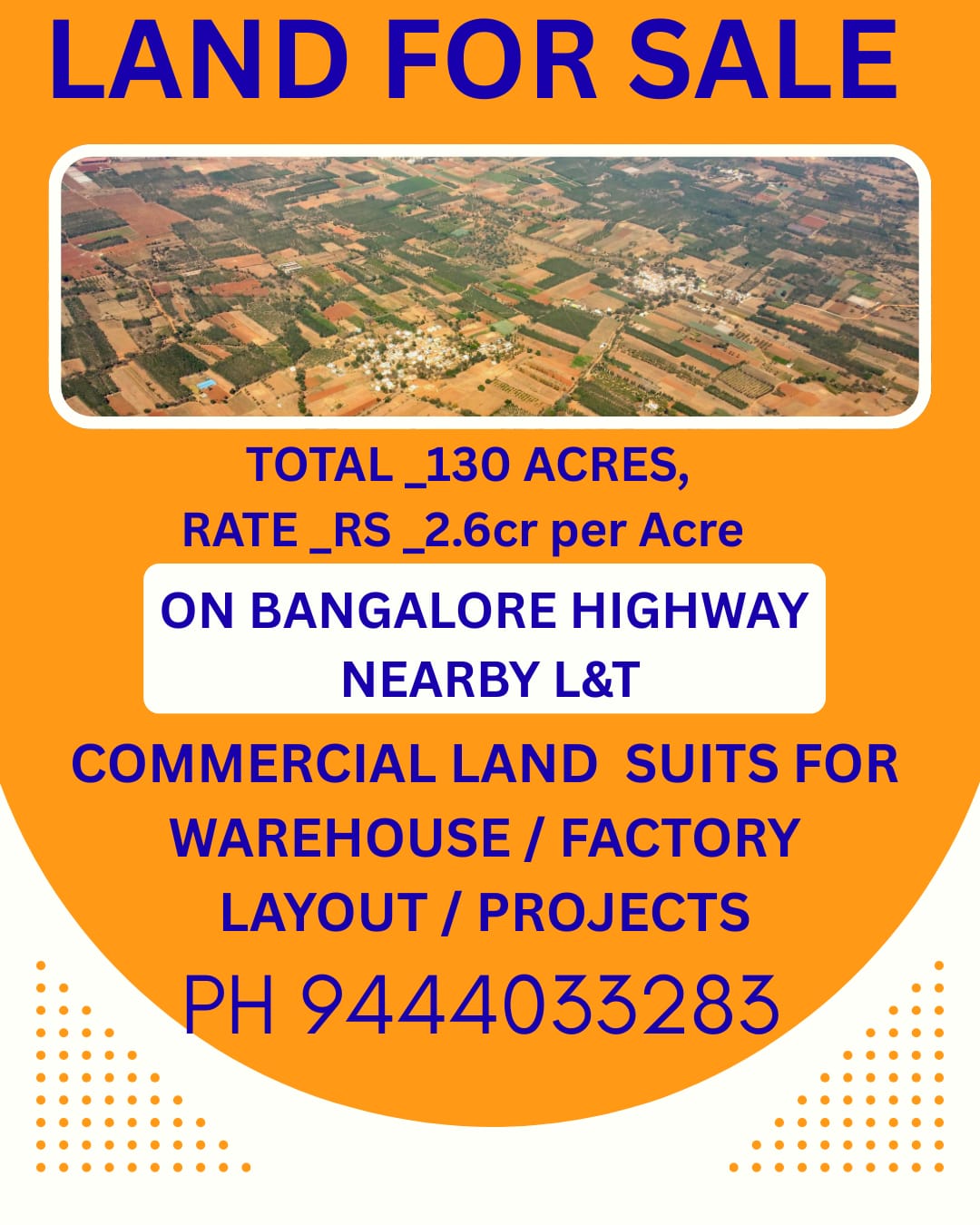 EnquiryTOTAL -130 ACRES , RATE -RS2.6 CRORE PER ACRE , ON BANGALORE HIGHWAY NEARBY L&T , COMMERCIAL ALND SUITS FOR WAREHOUSE / FACTORY , LAYOUT/ PROJECTS