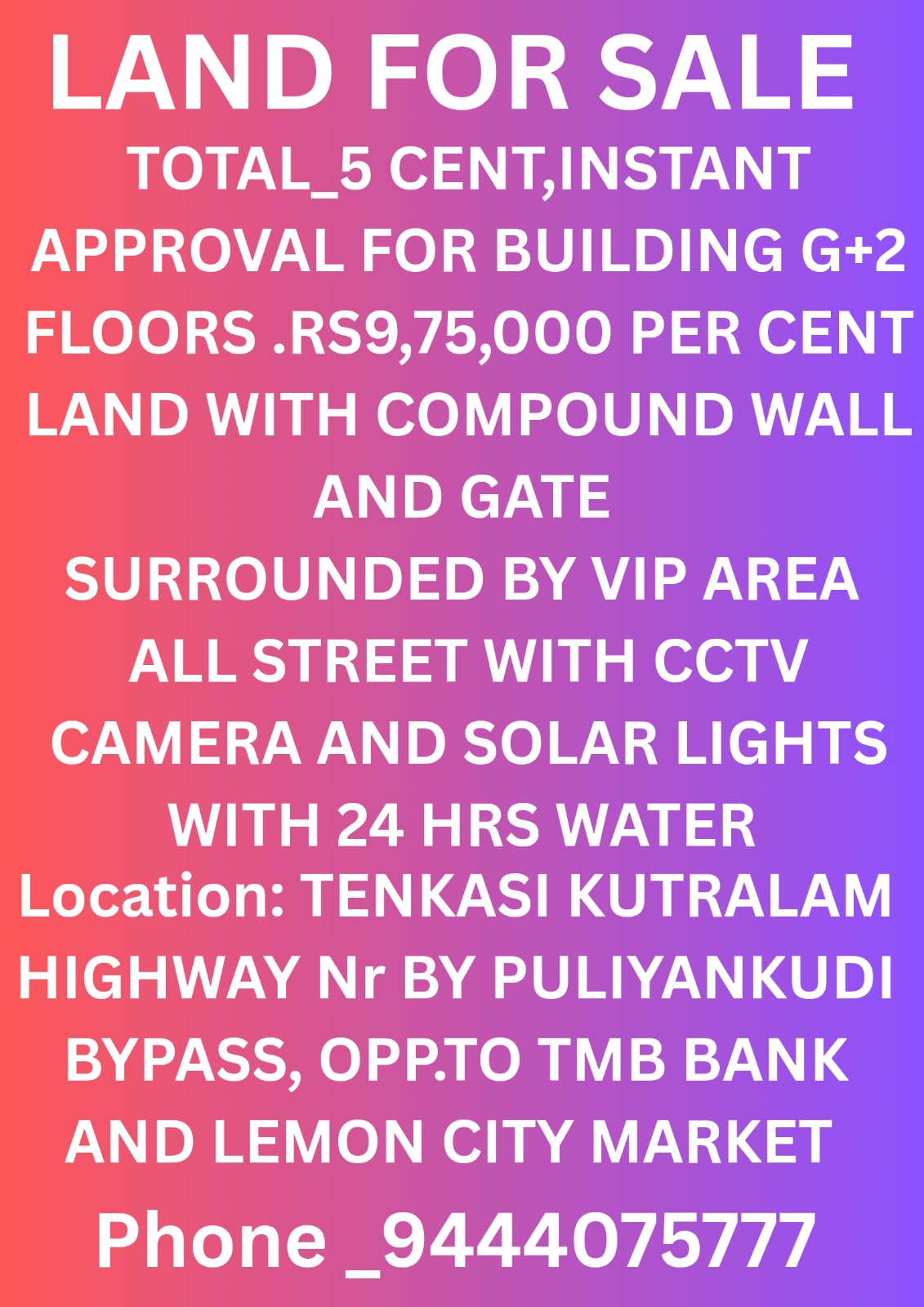 EnquiryTOTAL 5 CENT,INSTANT APPROVAL FOR BUILDING G+2 FLOORS . RS 9,75,000 PER CENT LAND WITH COMPOUND WALL AND GATE SURROUNDED BY VIP AREA ALL SREET WITH CCTV CAMERA AND SOLAR LIGHTS WITH 24 HRS WATER . LOCATION : TENKASI KUTRALAM HIGHWAY NR. BY PULIYANKUDI BYPASS , OPP. TO TMB BANK AND LEMON CITY MARKET