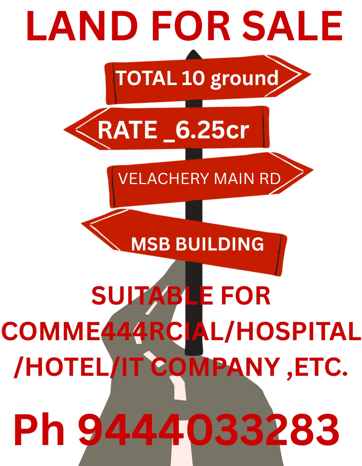 EnquiryTOTAL 10 GROUND , RATE RS6.25 CR , VELACHEY MAIN ROAD MSB BUILDING , SUITABLE FOR COMMERCIAL / HOSPITAL/ HOTEL / IT COMPANY , ETC.