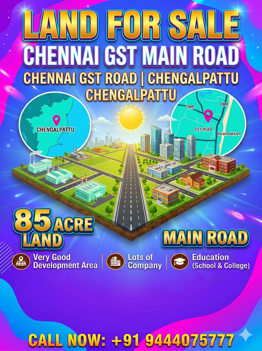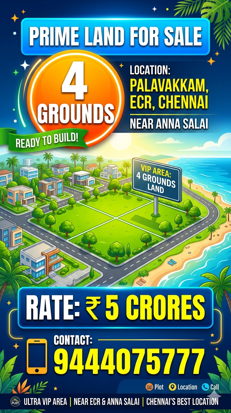 EnquiryPrime Land for Sale in Chennai – Palavakkam (ECR) Premium 4 grounds land available in a highly demanded VIP residential area. Perfect for villa, apartment, or investment purpose. Located near ECR & Anna Salai with excellent road connectivity and fast-developing surroundings.