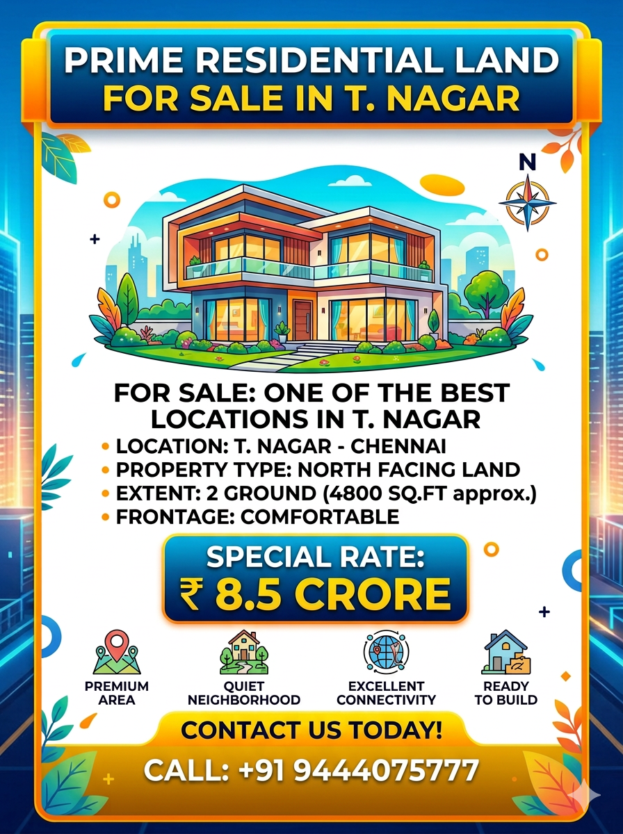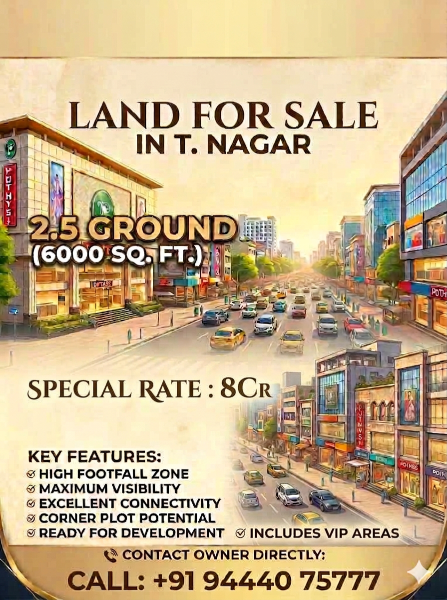 EnquiryA rare opportunity to own a premium 2.5 grounds (6000 sq.ft) land in the heart of T. Nagar, Chennai special rate : 8cr, Surrounded by prime establishments and VIP areas.