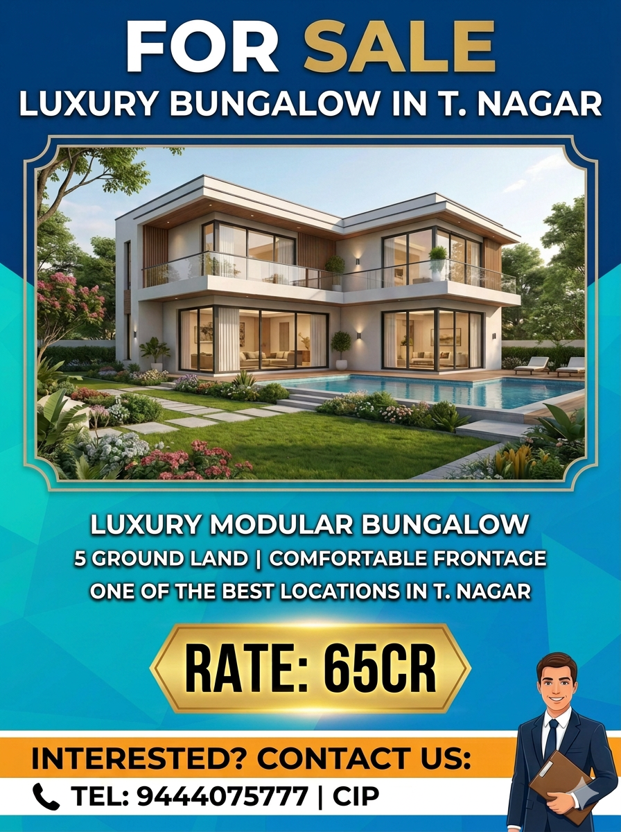 EnquiryLUXURY BUNGALOW IN T NAGAR , 5 GROUNDS , COMFORTABLE FRONTAGE , RATE : 65 CR