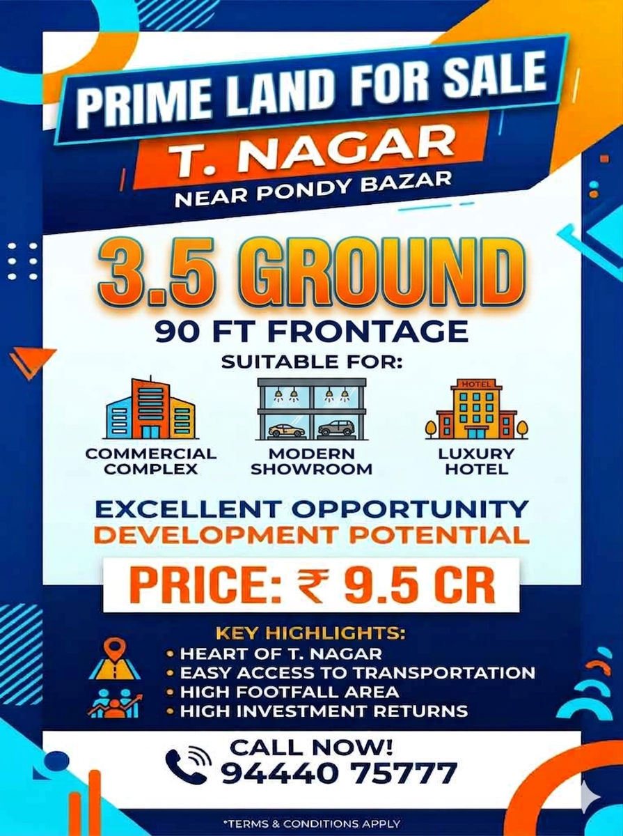 EnquiryA premium 3.5 grounds land with 90 ft frontage available in the heart of T. Nagar, near Pondy Bazaar This property is suitable for commercial complex, showroom, or hotel project. It has very good development potential and high investment value. Price is 9.5 Crores.