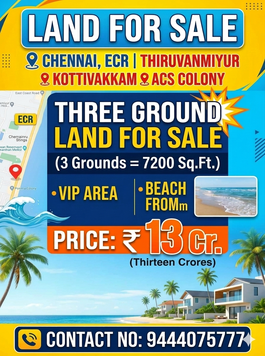 EnquiryPrime 3 grounds (7200 sq.ft.) land available in a highly elite VIP area near ECR. Perfect for luxury villa or high-value investment. Just minutes from the beach with excellent connectivity to city hotspots. price :13 cr